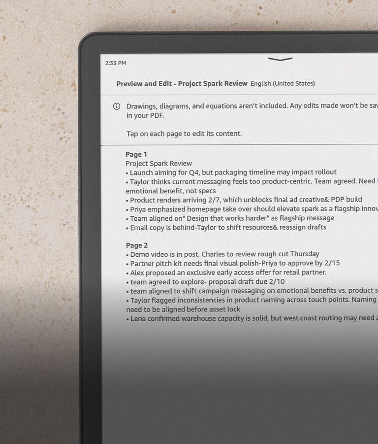 Kindle Scribe kết hợp khả năng viết không bị xao nhãng, truy cập tài liệu liền mạch và các tính năng bảo mật để giúp các nhóm làm việc hiệu quả và bảo vệ dữ liệu.