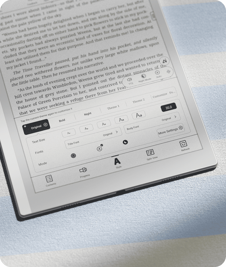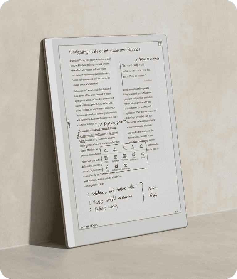 Tạo không gian đọc lý tưởng với ứng dụng đọc sách tích hợp NeoReader. Dễ dàng tùy chỉnh font chữ, khoảng cách dòng và lề trang để phù hợp với phong cách đọc của bạn. Khi đọc vào buổi tối hoặc trong những lúc yên tĩnh, bạn có thể chuyển sang Dark Mode⁷ để trải nghiệm dễ chịu hơn.