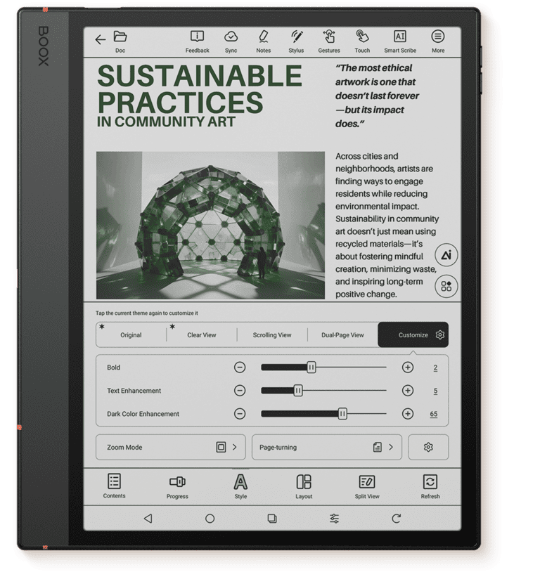 Chọn từ nhiều giao diện đọc khác nhau⁷ hoặc tự điều chỉnh để đạt hiệu quả tối đa. Hỗ trợ cả ebook reflow lẫn PDF, mỗi trang đều hiển thị trọn vẹn theo nhịp đọc riêng của bạn.