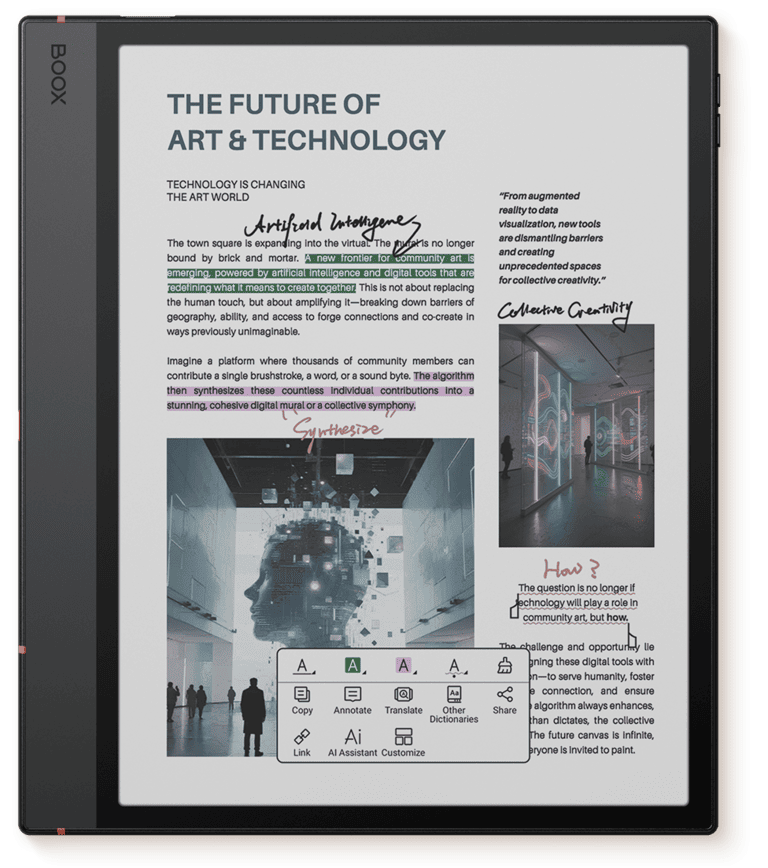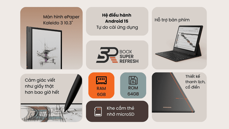 Nhờ bộ vi xử lý tám nhân mạnh mẽ và RAM 6GB, Note Air5 C xử lý mượt mà mọi tác vụ chuyên nghiệp. Dù là làm việc đa nhiệm, quản lý dự án hay xử lý công việc văn phòng, tất cả đều diễn ra nhanh chóng và hiệu quả. Với công nghệ BOOX Super Refresh³, từng thao tác vuốt và cuộn đều phản hồi tức thì, mang lại trải nghiệm liền mạch và đầy hứng khởi.