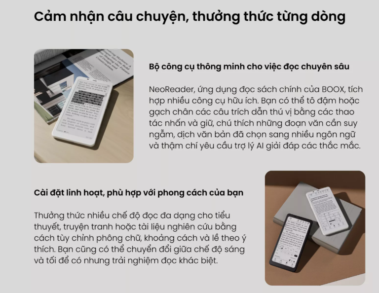 - Kho sách tích hợp sẵn trong máy, đủ các thể loại: tiểu thuyết, văn học, kỹ năng sống, ngôn tình, kinh doanh...
