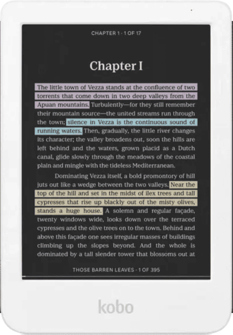 Giờ đây, với nhiều màu sắc có sẵn chỉ bằng một cú chạm ngón tay, bạn có thể đánh dấu sách điện tử của mình giống như sách in. Thêm, xóa hoặc thay đổi màu sắc khi bạn tiếp tục và dễ dàng xem nhanh tất cả các điểm nổi bật của bạn theo chương—các trích dẫn câu lạc bộ sách của bạn chưa bao giờ dễ dàng tìm thấy hơn thế!